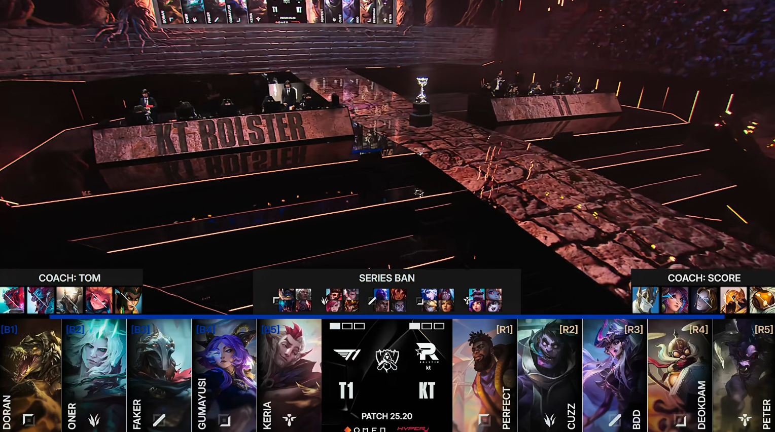 比赛18分钟关键的小龙团战,Keria波比“坚定风采”直接阻止了Cuzz猴子的开团,T1打出0换4,成功断了KT的小龙节奏,并将前期的劣势一举逆转。来到20分钟厄塔汗争夺,Doran安蓓萨大招冲到KT的后排C位,KT兰博与艾希阵亡,双方后续继续拉扯,T1成功将KT剩余四人击杀,厄塔汗被Oner赵信惩戒拿下。随后小龙刷新,又是Keria波比的先手开团,KT再度被打乱,T1打赢团战控下小龙。后续团战KT劣势已经不敌T1,最终T1赢下第一局比赛。