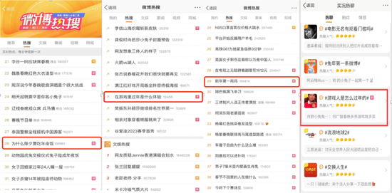 从魔性神曲到喜剧体裁,这些脑洞大开、有趣有梗的跨界内容契合春节场景,从不同维度自然地带起了「新年吃鸡」的整体氛围,并以其特有的内容属性,让「吃鸡」心智触达到更多目标受众,为品牌挖掘潜在用户创造了可能。不仅主题曲《吉吉吉》进入 QQ 音乐游戏榜单 TOP3,#和平精英抢占先鸡脱口秀首播#、#何广智回老家# 等相关话题也登上微博、抖音、快手等多个社交媒体平台的热搜榜单,足以说明大众对《和平精英》此次跨界内容的关注与认可。