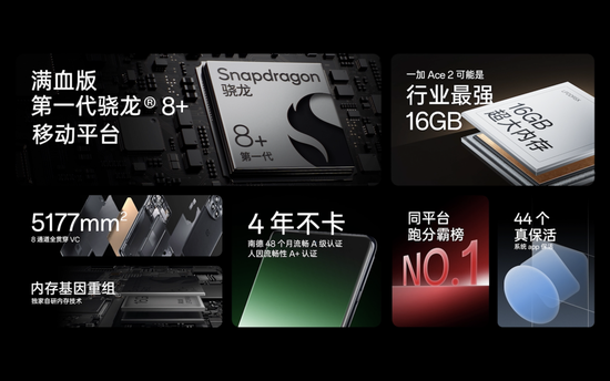 一加 Ace 2为用户带来同价位段前所未见的性能释放:搭载满血版骁龙8+ 移动平台 + LPDDR5X + UFS3.1的组合,安兔兔跑分高达 1149494 分,刷新骁龙8+ 移动平台最高纪录。内存配置上,一加 Ace 2继续坚持“大内存普及”思路,12GB+256GB 起步,至高支持 16GB+512GB,性能释放领先一步。配合独家自研的内存基因重组技术,一加 Ace 2 重负载场景丢帧次数降低 50%,后台应用驻留最多达 44 个,后台驻留能力成为同平台第一。同时,一加 Ace 2 还获得南德 48 个月 A 级流畅认证及 SGS 人因流畅性 A+ 认证。