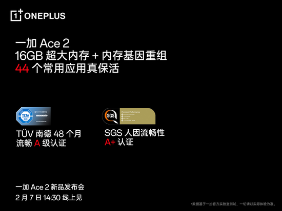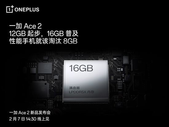 2月6日,一加正式宣布,一加 Ace 2将淘汰 8GB 内存,由12GB起步,至高配备16GB大内存,搭载独家自研「内存基因重组」技术,结合旗舰级LPDDR5X内存配置,不断刷新安卓流畅体验认知。一加中国区总裁李杰表示,“性能手机就不该用8GB,今天,我们正式宣布Ace系列将彻底淘汰8GB,一加 Ace 2将直接12GB起步,并普及16GB,让更多用户体验到大内存带来的极致流畅体验。”