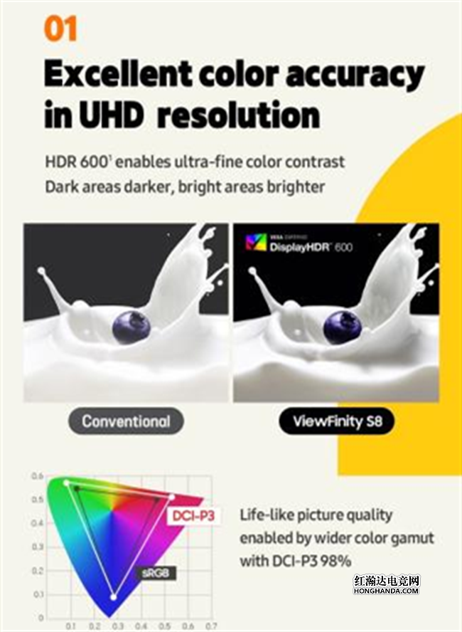 采用DCI-P3 98%的更宽色域,可实现栩栩如生的画质