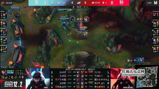 中期JDG在自家蓝buff野区接连抓死了厄斐琉斯和发条,本以为可以控下大龙,就此吹响反攻的号角,不料Weiwei的佛耶戈闪现下龙坑抢到了大龙,BLG在失去双C的情况下三打五打出0换4大获全胜!JDG下路水晶和中路高地塔告破,经济落后超过了1万。27分钟BLG强势推进上路高地,摧枯拉朽打出0换5团灭JDG一波结束比赛,稳健运营2-1击败JDG!