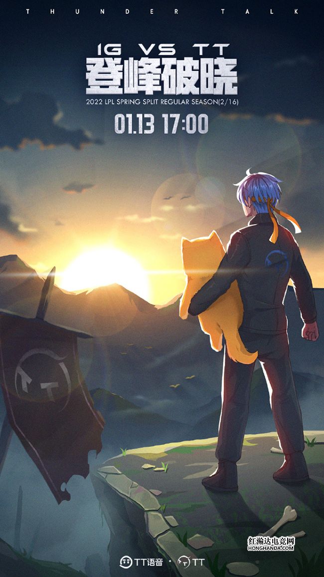 TT的海报标题是“登峰破晓”,玩起了iG由来已久的“翻山梗”~身穿TT队服的蓝发少年左手抱着iG的吉祥物小柴犬,正在山顶欣赏远方的日出,旁边TT的旗帜暗示今天TT将成功翻过iG这座山峰。TT在春季赛揭幕战惨遭OMG零封,虽然“南芙”组合在对线期的表现相当亮眼,但TT上中野的发挥以及团队决策仍需进步,不知Puff和Southwind会和老东家碰撞出怎样的火花?
